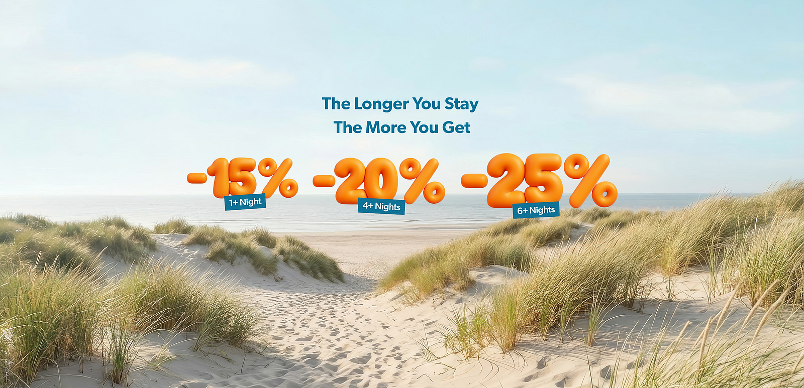 Celebrate our anniversary with at least 15% off your seaside holiday, all year long, even for just one night. Staying longer? Your advantage automatically increases.